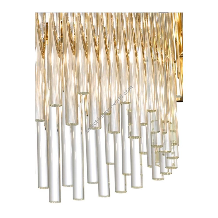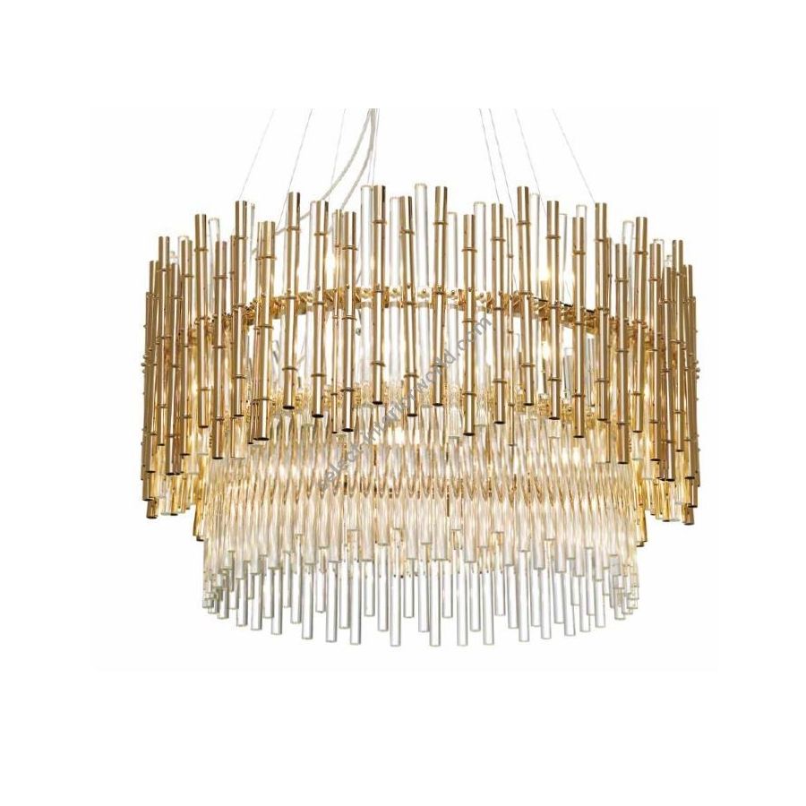 Chandelier in glass and brass elements in the shape of bamboo. Lighting item that diffuses the light with great effect in the surrounding environement creating a warm and welcoming atmosphere.