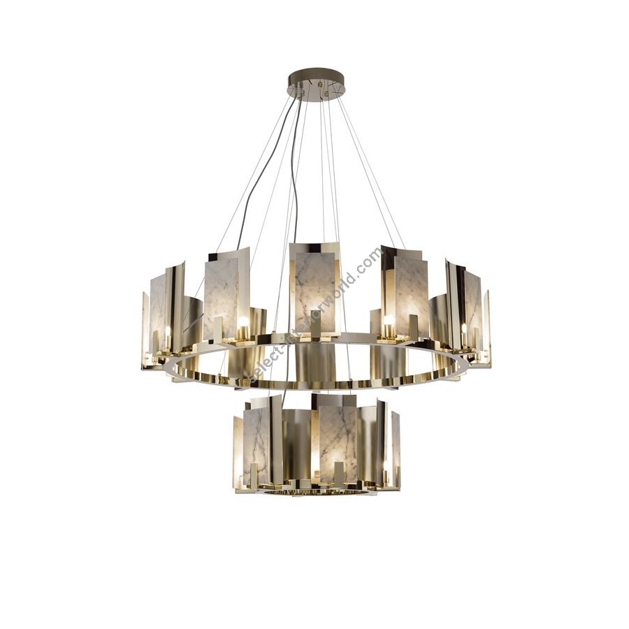 Round chandelier in brass and white Carrara marble. Lighting item that diffuses the light with great effect in the surrounding environement creating a warm and welcoming atmosphere.