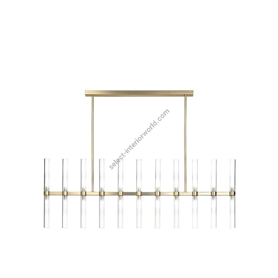 Rectangular chandelier with borosilicate glass tubes with double switch 11+11 bulbs. Structure in brushed soft gold finishing. Lighting item that diffuses the light with great effect in the surrounding environement creating a warm and welcoming atmosphere.