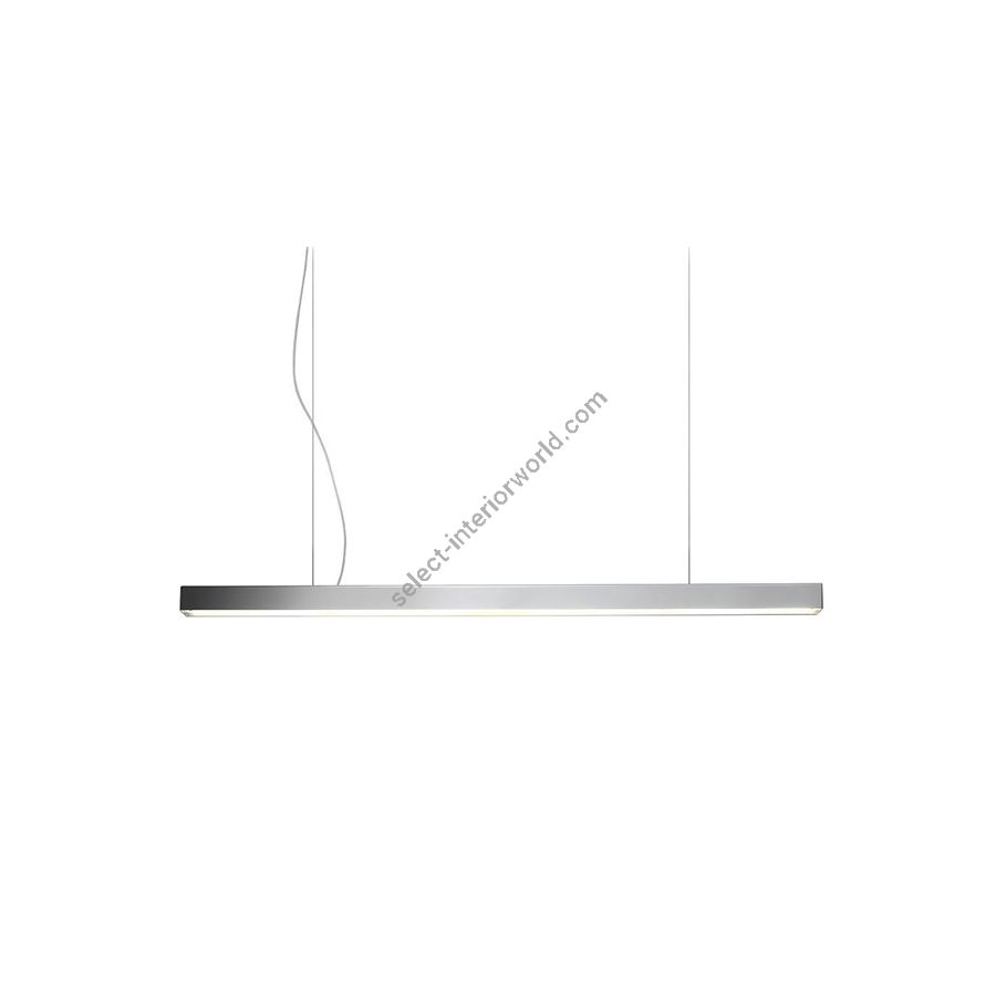 Square metal bar with LED lighting and polycarbonate diffuser. Strip led 17 W/m (tot 51W-2625 lumen) + internal power supply to the bar, steel cable on ceiling. Lighting item that diffuses the light with great effect in the surrounding environement creating a warm and welcoming atmosphere.