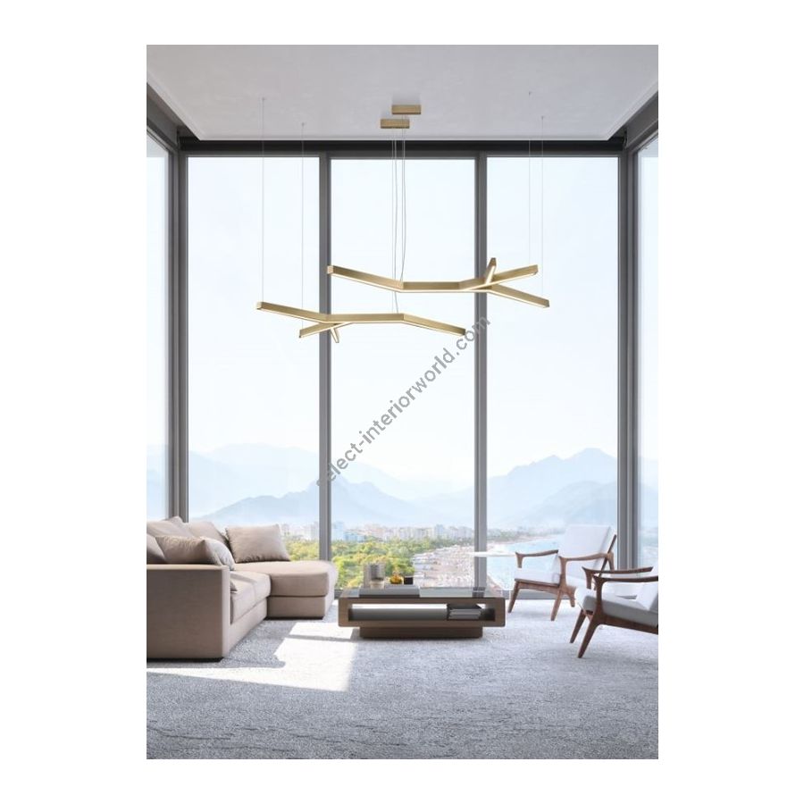 Brushed soft gold metal branch with LED lighting and white metahacrylate diffuser. Lighting item that diffuses the light with great effect in the surrounding environement creating a warm and welcoming atmosphere.