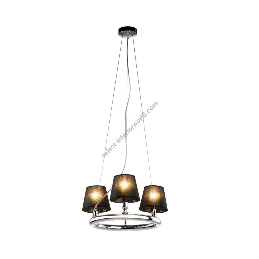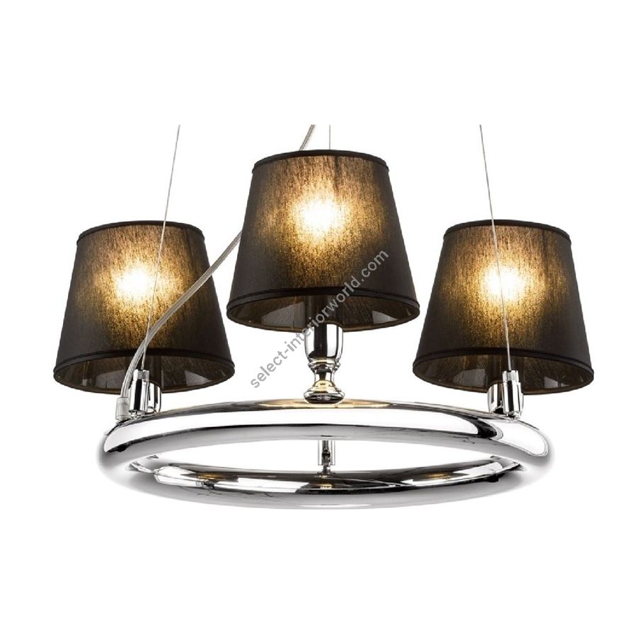 Metal ring nikel chandelier with black lampshades. Lighting item that diffuses the light with great effect in the surrounding environement creating a warm and welcoming atmosphere.