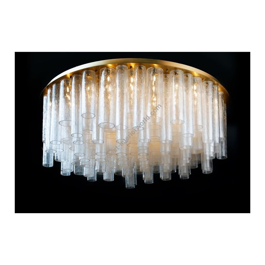 Ceiling lamp in painted old gold and Murano ""Pulegoso""Cylinders. Lighting item that diffuses the light with great effect in the surrounding environement creating a warm and welcoming atmosphere.
