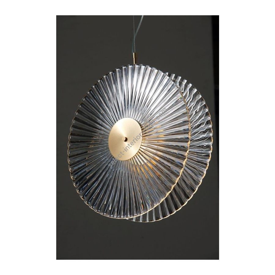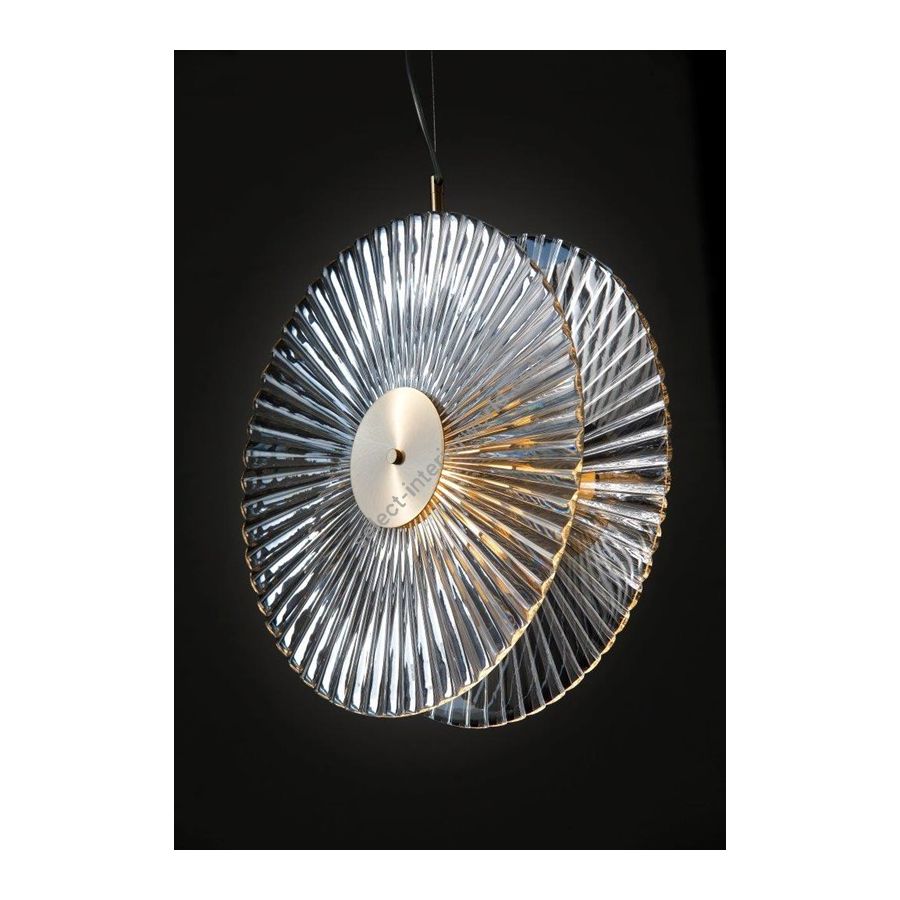 Chandelier with double crystal disc "Visù cut". Lighting item that diffuses the light with great effect in the surrounding environement creating a warm and welcoming atmosphere.