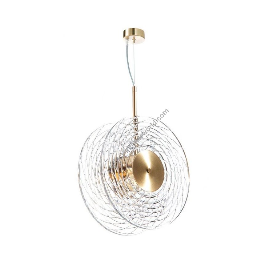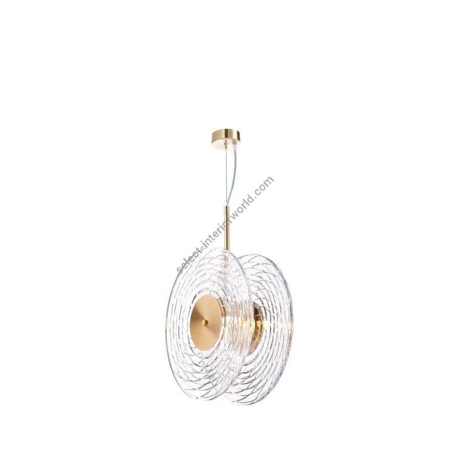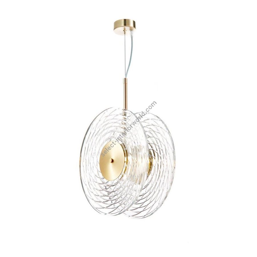 Chandelier with double crystal disc "RIPPLE cut". Lighting item that diffuses the light with great effect in the surrounding environement creating a warm and welcoming atmosphere.