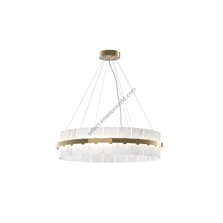 Round chandelier in brass with Carrara marble tiles. Lighting item that diffuses the light with great effect in the surrounding environement creating a warm and welcoming atmosphere.