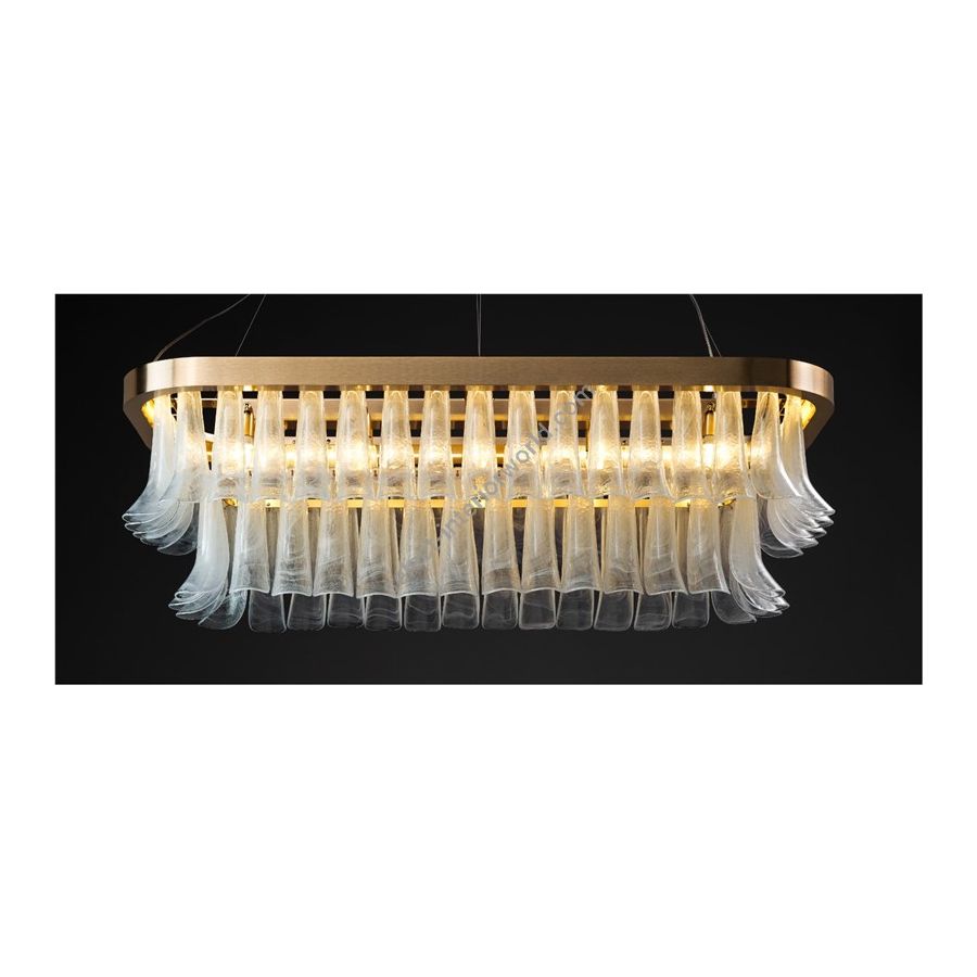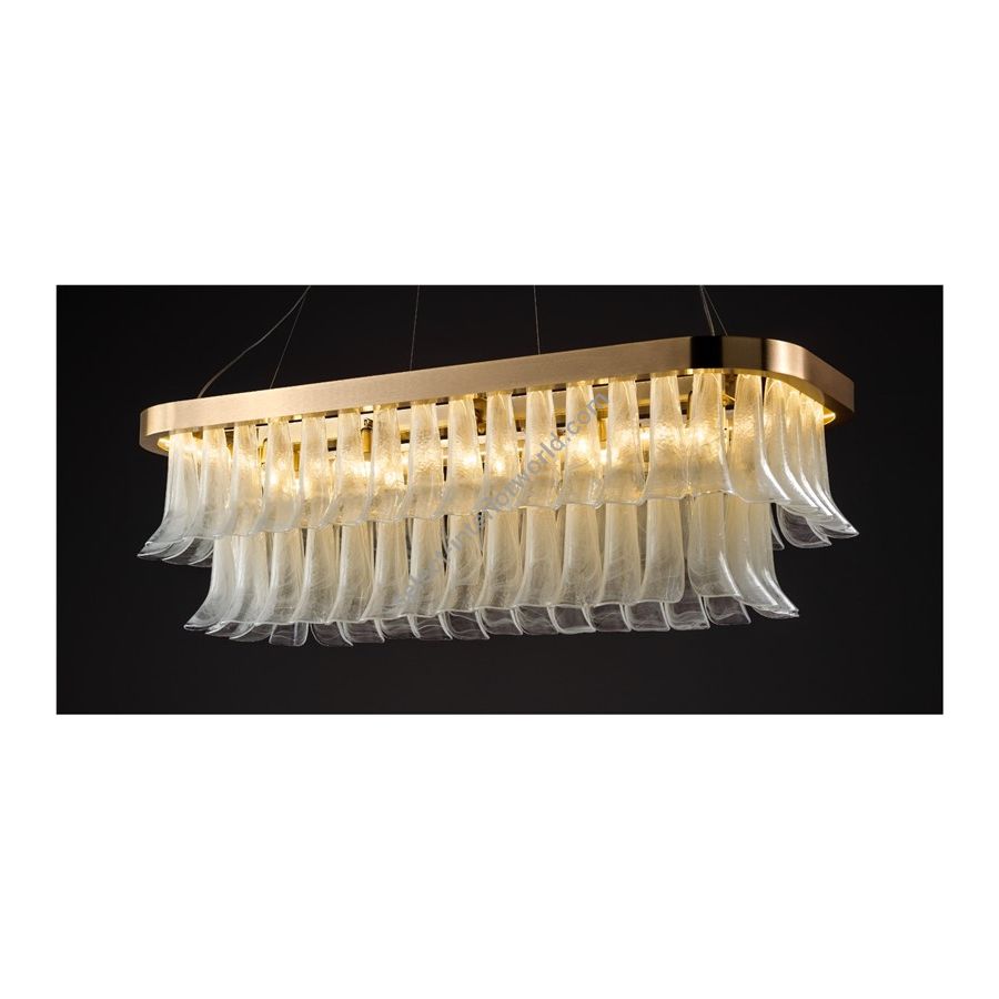 Chandelier Oval with Murano glass pendants in clear and white color. Lighting item that diffuses the light with great effect in the surrounding environement creating a warm and welcoming atmosphere.