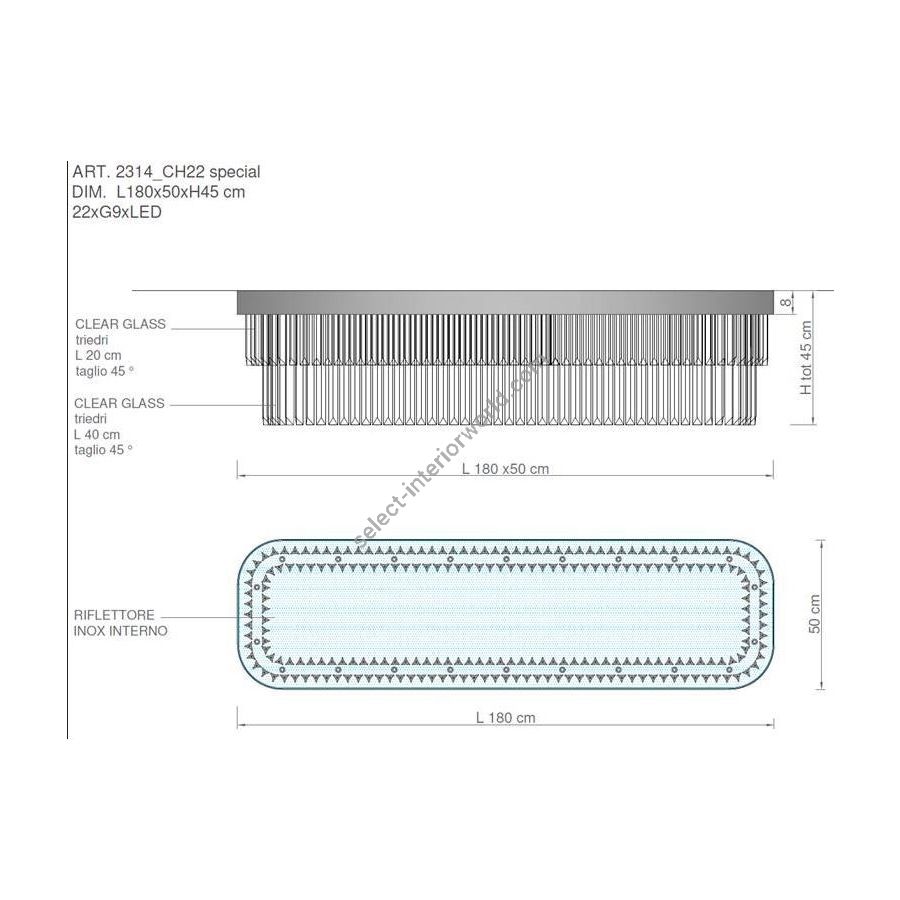 Chandelier with transparent trihedrons. Lighting fixture that diffuses the light into the surrounding environment with great effect, creating a warm and welcoming atmosphere. Shiny metallic band in SG Soft Gold. Hooking system with adjustable steel cables.
