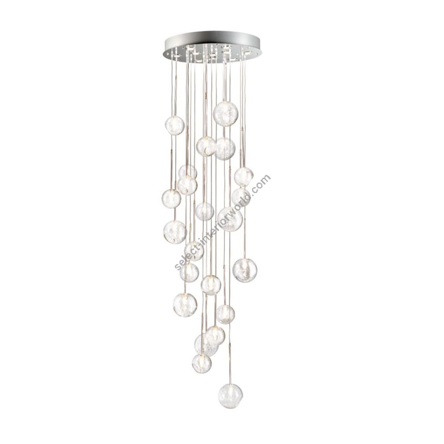 Cascade chandelier with clear crystal balls. Lighting item that diffuses the light with great effect in the surrounding environement creating a warm and welcoming atmosphere.