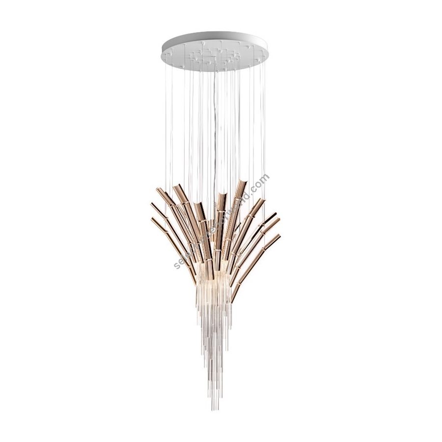 Cascade chandelier with Bamboo with clear glass. Chandelier body H 115 cm with 1 meter of adjustable steel cable. Ceiling base d. 50 cm painted in White Ral. Lighting fixture that diffuses the light into the surrounding environment with great effect, creating a warm and welcoming atmosphere.