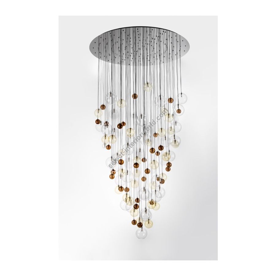 The modern cascading chandelier with multicolored blown glass spheres is a stunning and decorative addition to any space, especially youth-oriented and spacious environments. The multicolored blown glass spheres create a lively and playful effect, diffusing a soft and enchanting light. Their unique design captures the gaze and adds a touch of originality to the surrounding environment.