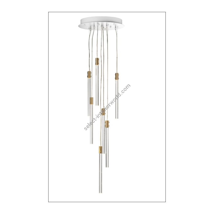 The modern chandelier features an elegant and minimalist design with 7 transparent glass pendants. Each pendant houses an LED light, creating bright and contemporary illumination. Suspended from a flat ceiling panel, this chandelier adds a touch of sophistication to any space, seamlessly fitting into various interior aesthetics.