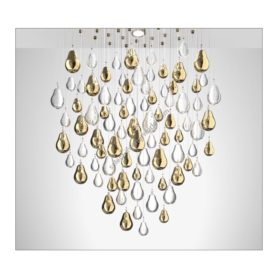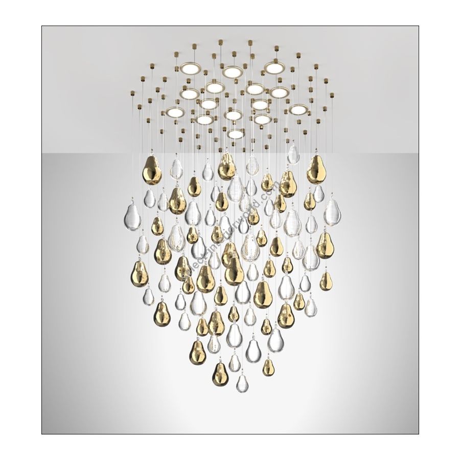 This luxurious chandelier, featuring transparent Murano glass droplets and 24K gold details, is an impeccable choice to enhance dining rooms, entrances, and majestic spaces. Its timeless elegance and customizable dimensions make it an exclusive lighting fixture, capable of adding a touch of luxury and distinctive style to any environment where it is placed.