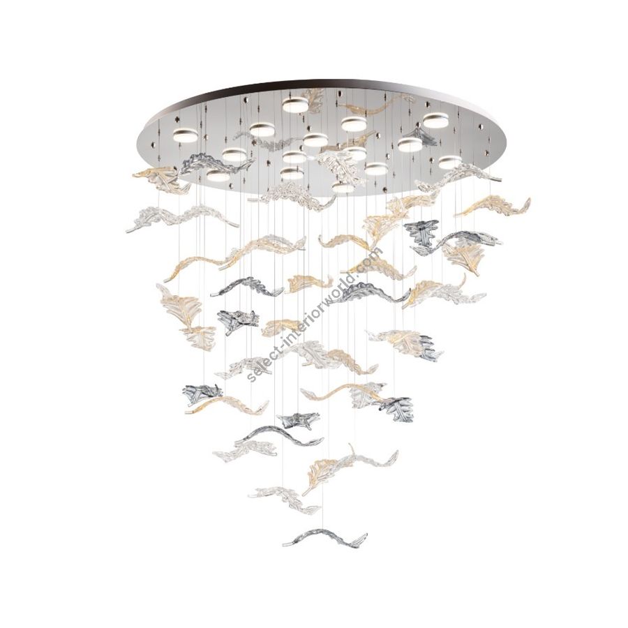 Leaf Murano Glass Chandelier is an elegant fusion of tradition and modernity. Transparent, gold, and gray Murano leaves float delicately, adding a touch of sophistication. The metal plate with a mirror-effect stainless steel reflector creates a stylish base, reflecting the beauty of the leaves and amplifying the brightness. In short, a chandelier that combines class and style in a captivating design.