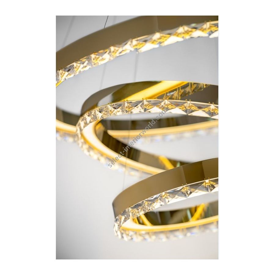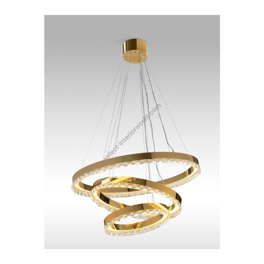 Galaxy Rings with Crystal – Chandelier Galaxy Rings with Crystal is a striking contemporary chandelier composed of circular metal rings with a 24K gold finish, enhanced by Asfour crystals that create extraordinary reflections and sparkling light effects. The rings can be adjusted in height through steel suspension cables, allowing you to design your own custom installation and achieve a dynamic, architectural composition. The pre-installed LED strips emit a soft downward light, providing comfortable, diffused illumination without glare. Available in other finishes upon request, to perfectly complement various interior styles. Dimensions: Maximum diameter Ø 100 cm (˜ 39.4”) Height 50 cm (˜ 19.7”) – adjustable steel cable (100 cm / 39.4”) Weight 35 kg (˜ 77.2 lb) A true statement piece, ideal for modern interiors, dining areas, living rooms, and representative spaces, where elegance and brilliance merge in perfect harmony.