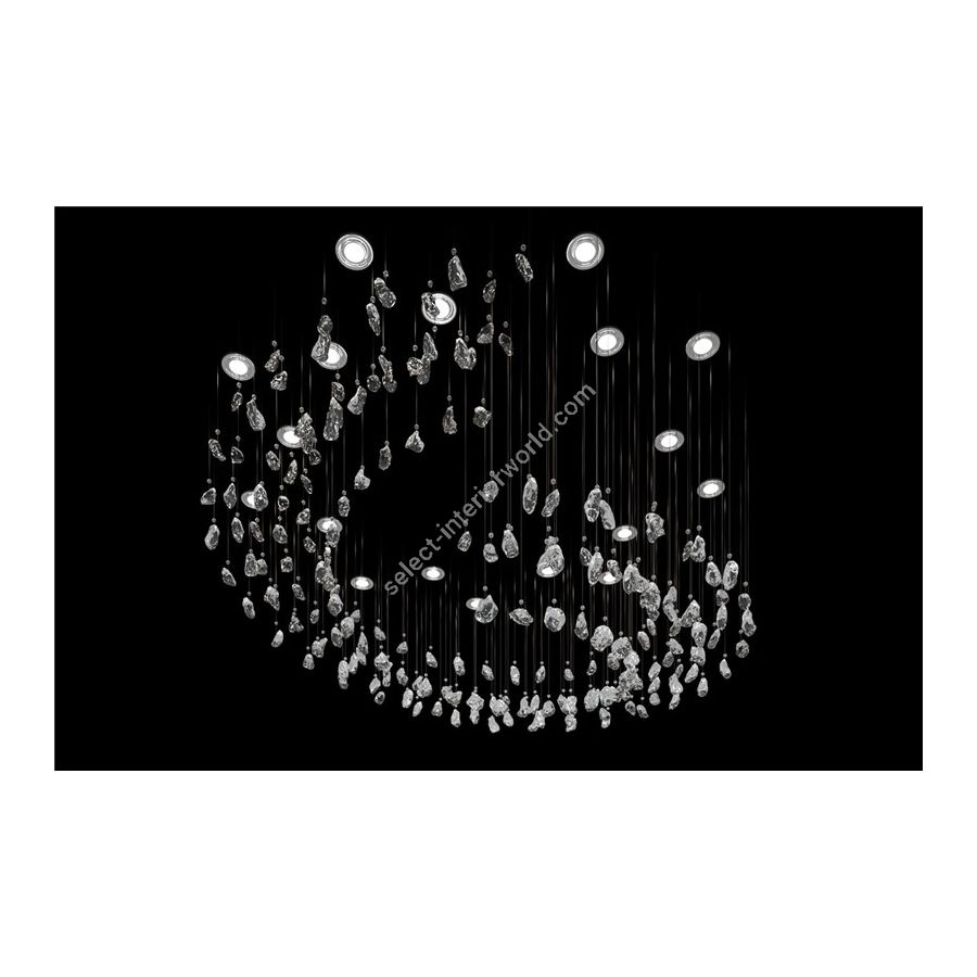 Ice effect chandelier with spiral shape. Composed of 200 elements. The chandelier includes 200 ice cubes and 200 steel cables with relative cable lock. Not included spot. To be fixed directly to the ceiling.