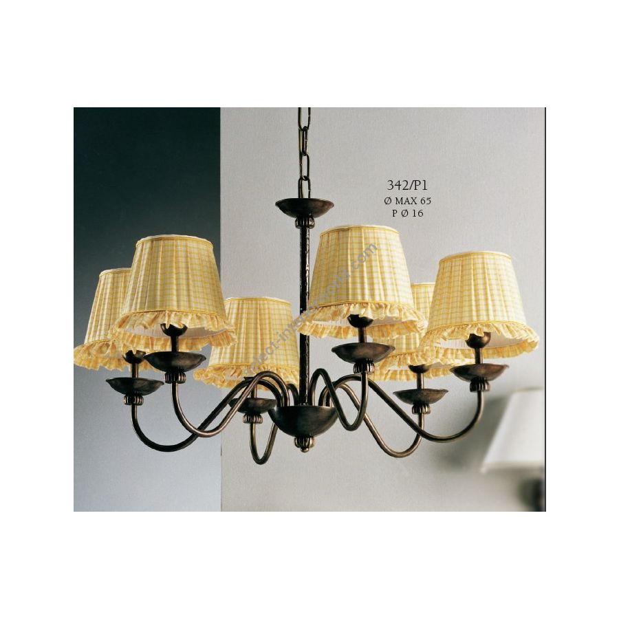 6 lights chandelier with 6 pleated conical caps. Lighting fixture that diffuses the light into the surrounding environment with great effect, creating a warm and welcoming atmosphere.