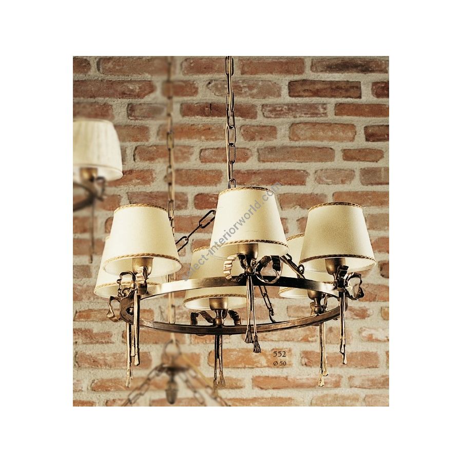 6 lights ""church"" chandelier with ivory conical caps. Lighting fixture that diffuses the light into the surrounding environment with great effect, creating a warm and welcoming atmosphere.