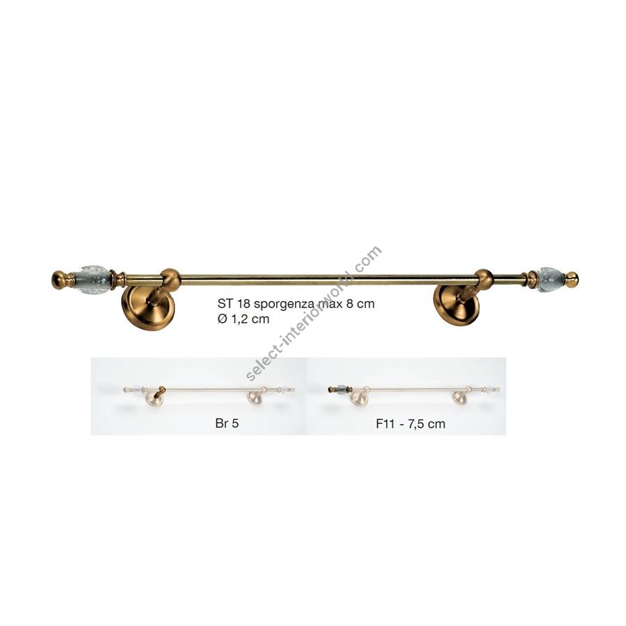 Sticks or towel holders, with an “olive” Murano glass finish available in dark amber or transparent colour. Brass finish: old gold - old silver. Functional elements that create an extremely elegant, welcoming and high-value bathroom.