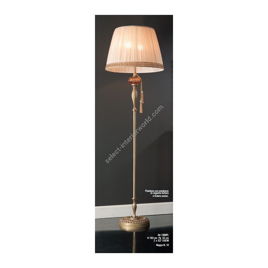 Floor lamp with amber crystal and fabric lampshade. Tassel excluded. Lighting item that diffuses the light with great effect in the surrounding environement creating a warm and welcoming atmosphere.