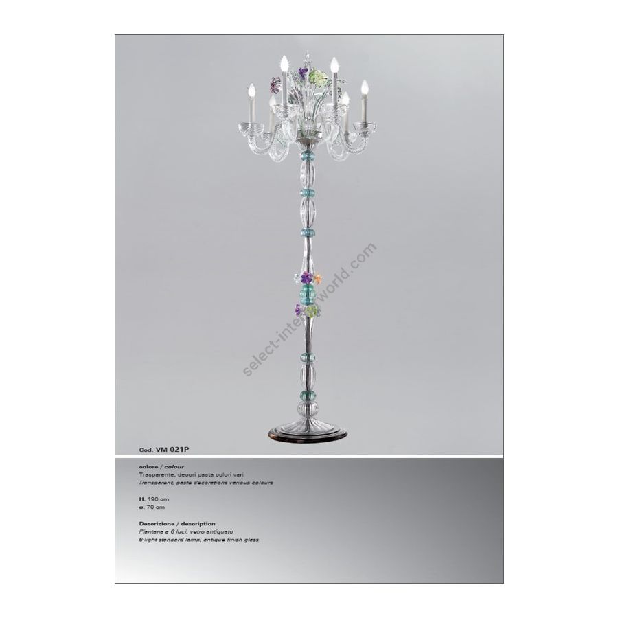 Floor lamp with 6 lights, transparent old-fashioned glass, paste decorations in various colours. Lighting fixture that diffuses the light into the surrounding environment with great effect, creating a warm and welcoming atmosphere.