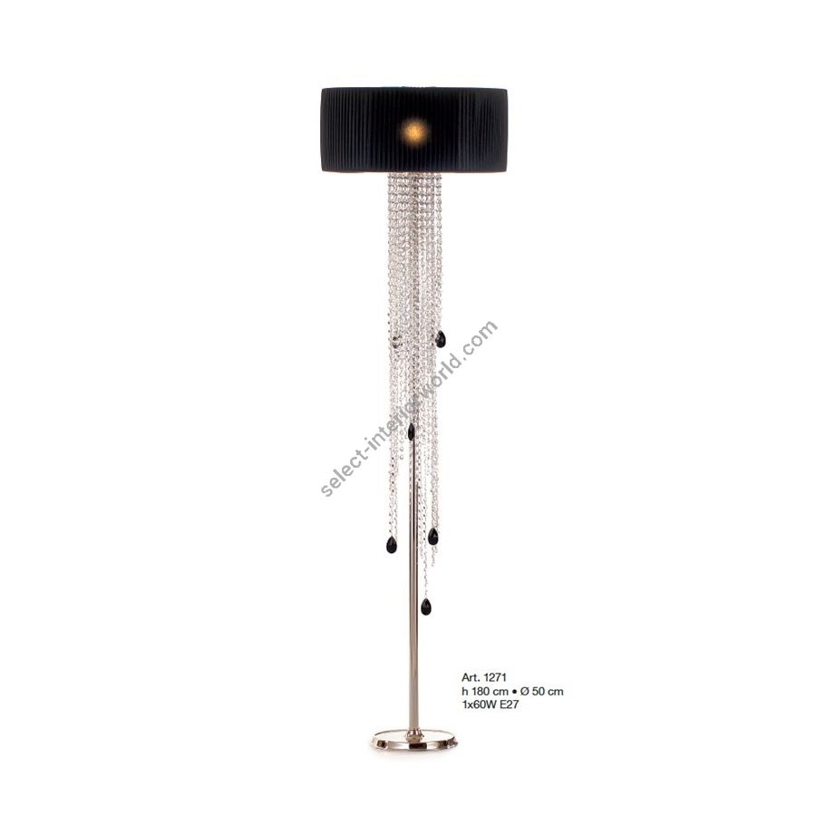 Floor lamp with cylindrical lampshade and crystal pendants. Lighting item that diffuses the light with great effect in the surrounding environement creating a warm and welcoming atmosphere.