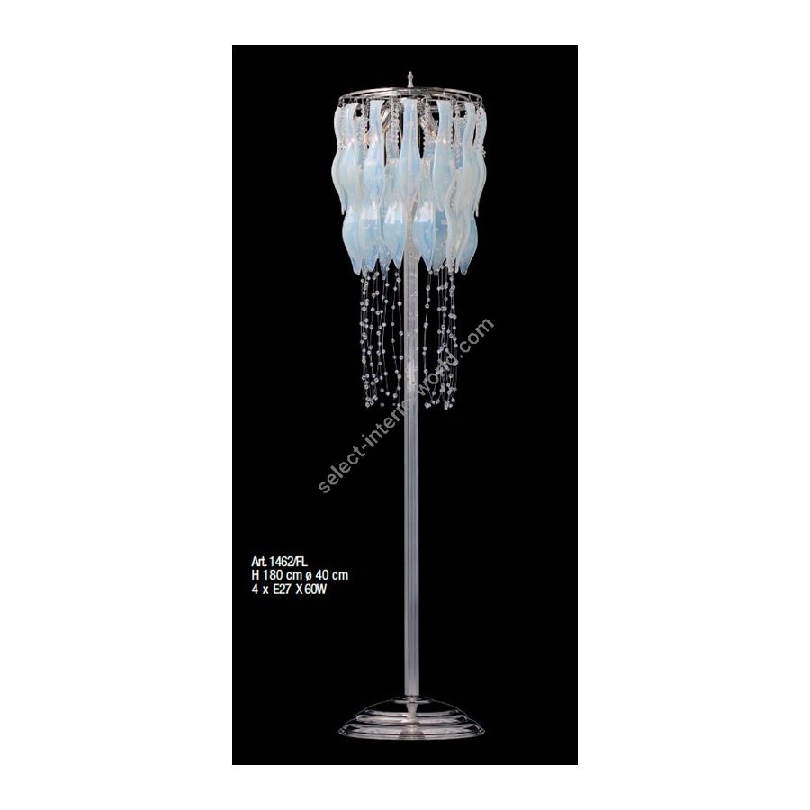 Chrome floor lamp with mother-of-pearl Murano glass leaves and Swarovski® pearls. Lighting fixture that diffuses the light into the surrounding environment with great effect, creating a warm and welcoming atmosphere.