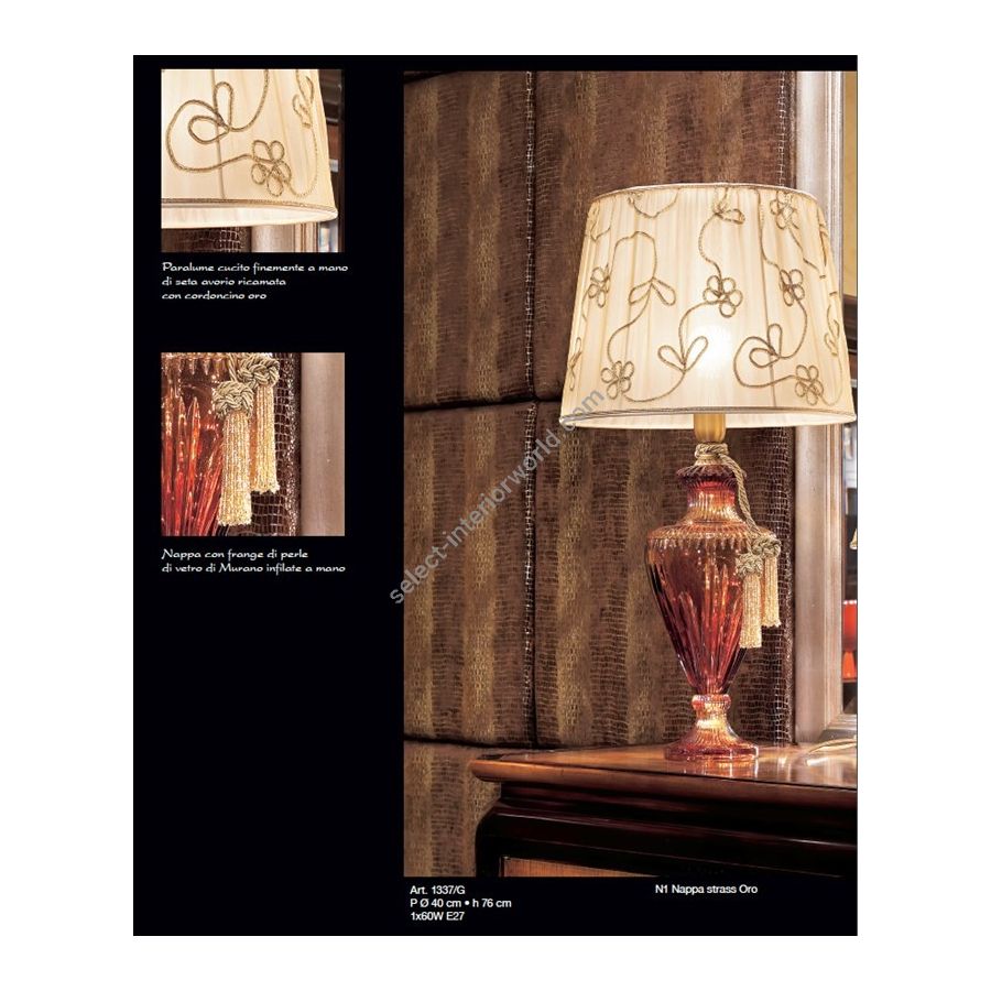 Lamp in amber cut crystal with lampshade embroidered with stylized flowers, conical lampshade. Lighting fixture that diffuses the light into the surrounding environment with great effect, creating a warm and welcoming atmosphere.