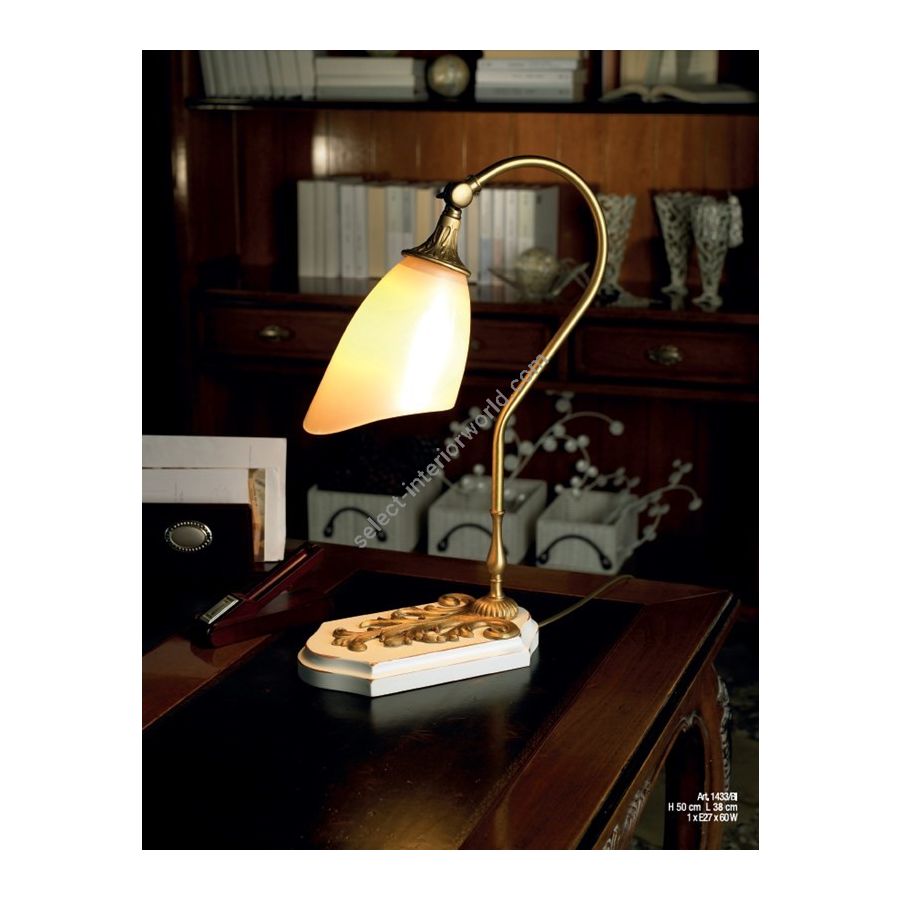 Desk lamp with wooden base and old gold structure with white glass both inside and outside. Lighting fixture that diffuses the light into the surrounding environment with great effect, creating a warm and welcoming atmosphere.