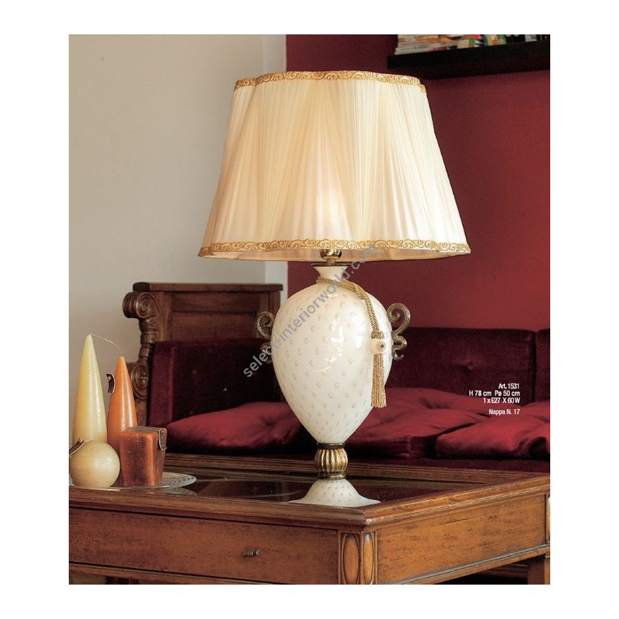 Traditional Table Lamp in Murano glass white with gold powder and details in black & gold. Lampshade in silk & chiffon completely hand-made. Tassel N17 not included in the price. Lighting item that diffuses the light with great effect in the surrounding environement creating a warm and welcoming atmosphere.