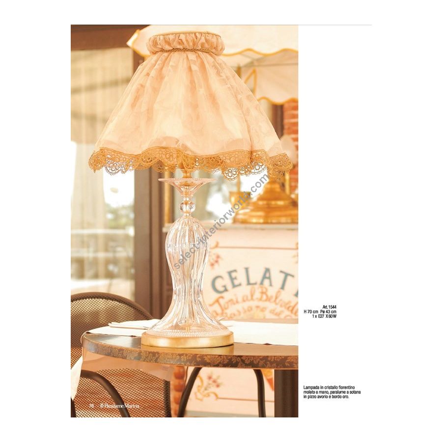 Lamp in hand-cut Florentine crystal, ivory lace skirt lampshade with gold edge. Lighting fixture that diffuses the light into the surrounding environment with great effect, creating a warm and welcoming atmosphere.