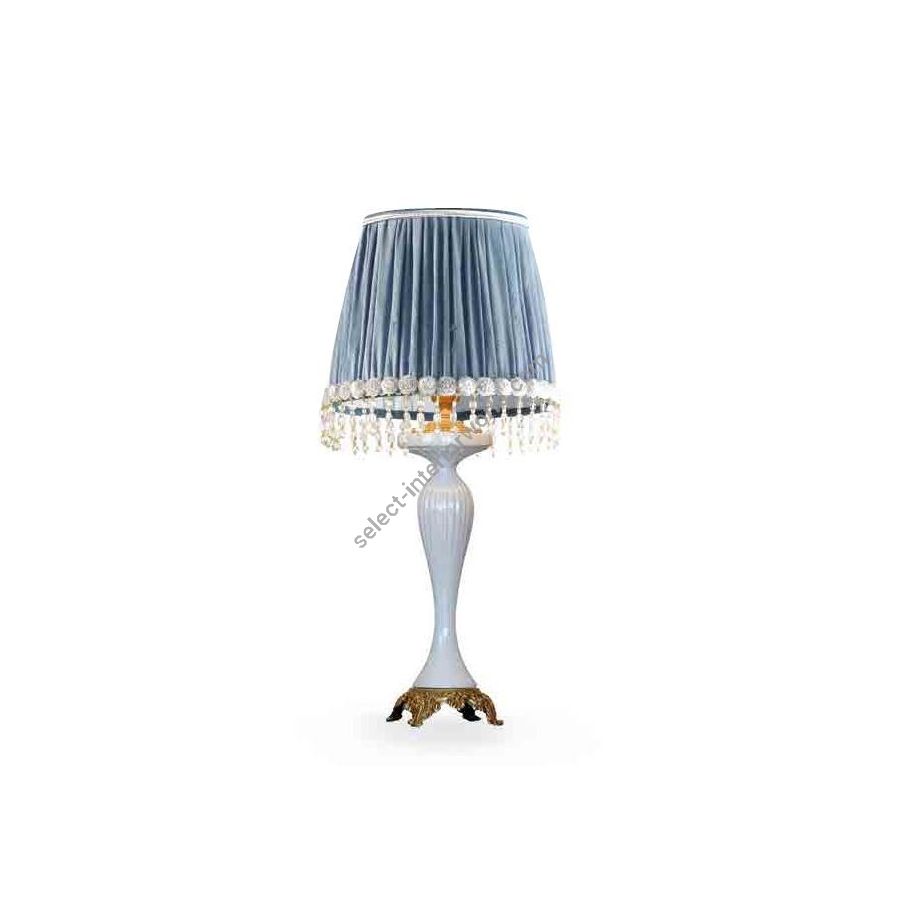 Table lamp in white ceramic with brass elements and fabric lampshade. Lighting item that diffuses the light with great effect in the surrounding environement creating a warm and welcoming atmosphere.
