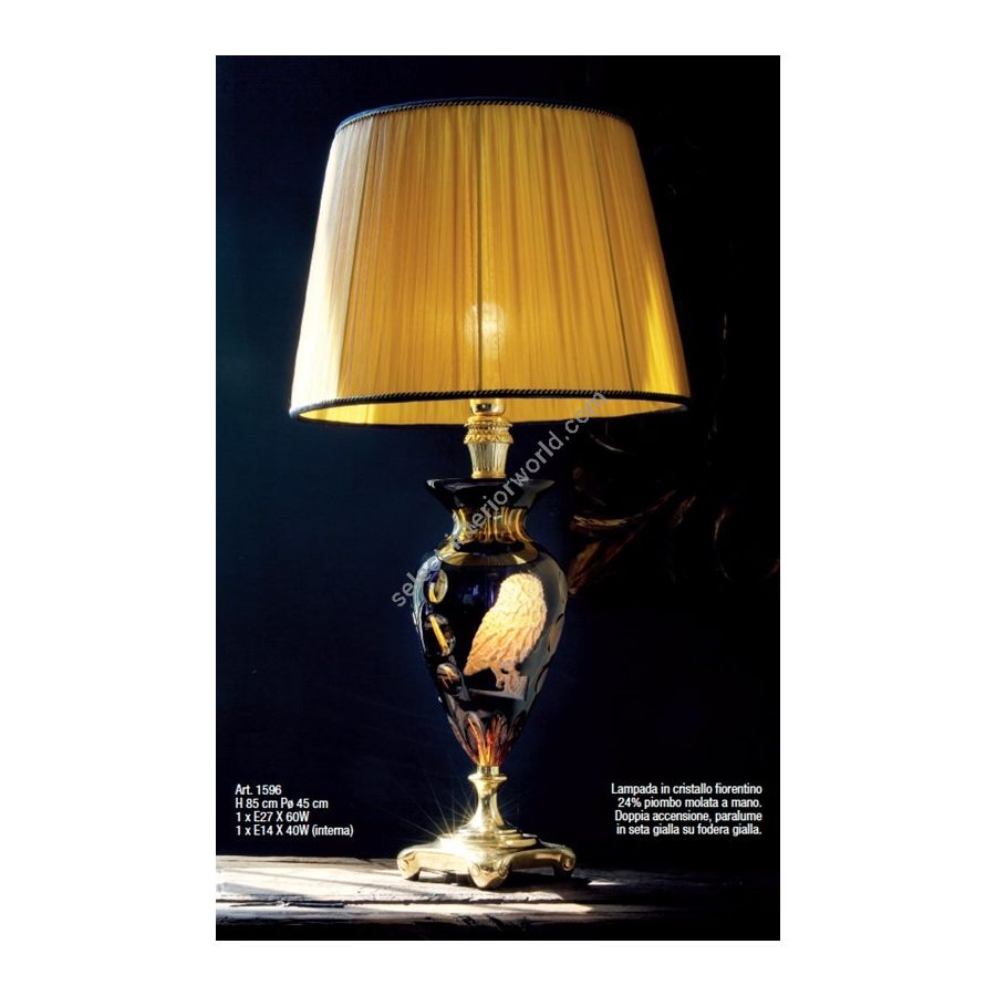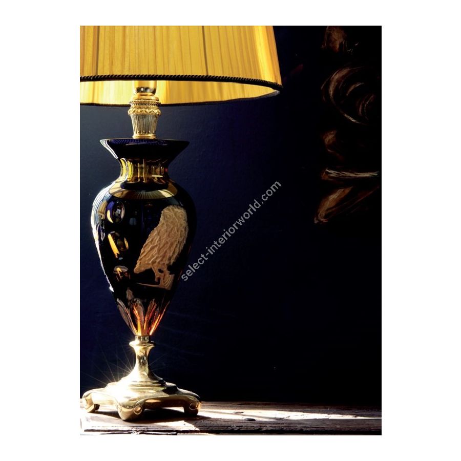 Luxurious table lamp in Florentine crystal carved by hand. There is double switch which illuminates all the beauty of the amber/blue crystal from inside. The silk lampshade made by hand completes this masterpiece of artisan craftsmanship. Lighting item that diffuses the light with great effect in the surrounding environement creating a warm and welcoming atmosphere.