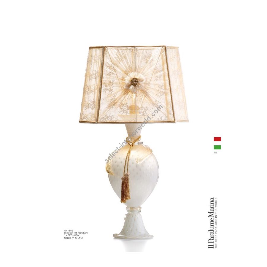 Murano Glass table Lamp in White and gold. Hand-Made fabric lampshade in lace. Tassel is not included in the price. Lighting item that diffuses the light with great effect in the surrounding environement creating a warm and welcoming atmosphere.