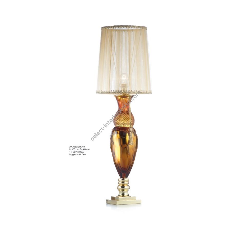 Table lamp in amber Florentine hand-cutted crystal and amber mirror effect, pb24% (tassel N44 Oro is not included). Lighting item that diffuses the light with great effect in the surrounding environement creating a warm and welcoming atmosphere.