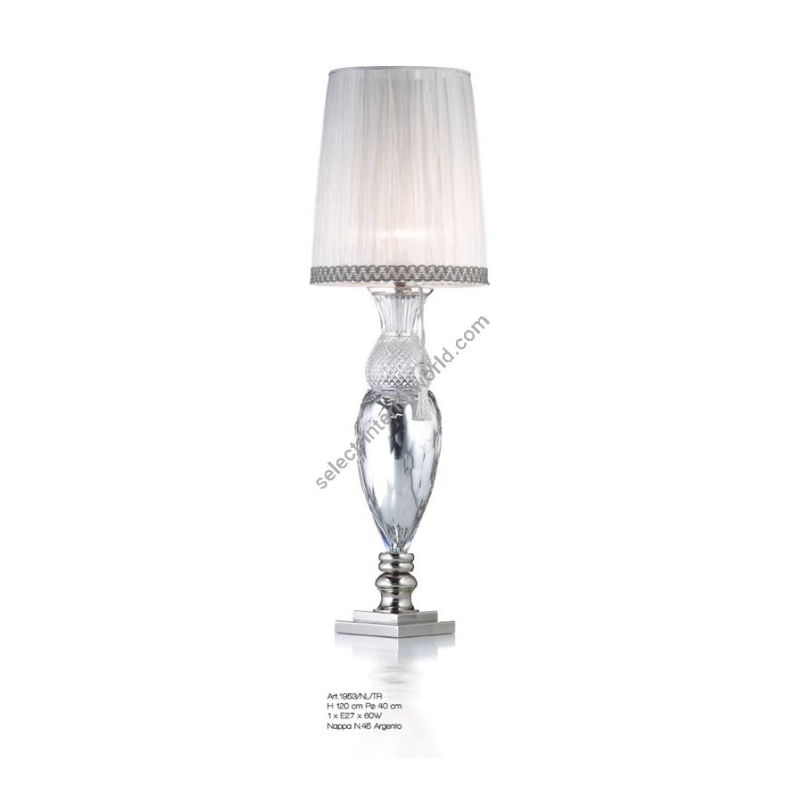 Table lamp in clear and silver Florentine crystal (tassel N45 is not included). Lighting item that diffuses the light with great effect in the surrounding environement creating a warm and welcoming atmosphere.