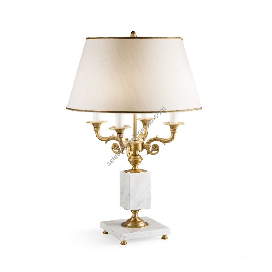 An Empire-style lamp with a white Carrara marble base and brass components, complete with an ivory shantung lampshade, can be customized for both the type of marble and the lampshade fabric. This piece of furniture embodies elegance and luxury, diffusing a soft light and creating a cozy atmosphere.