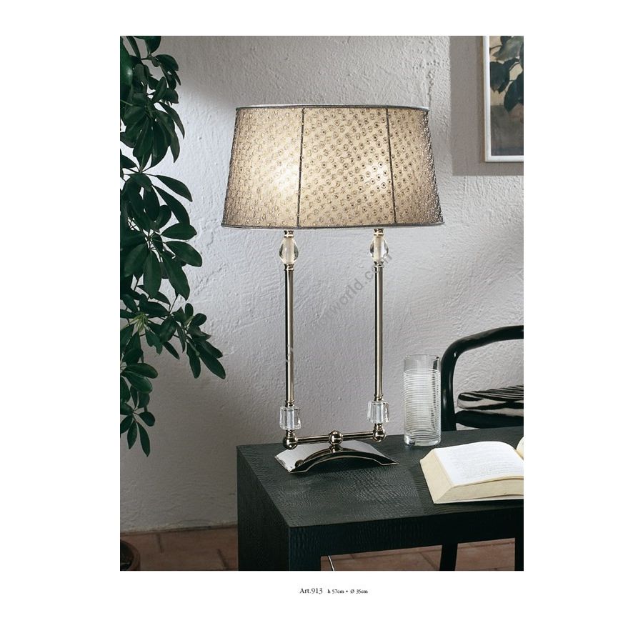 Table lamp in brass with clear glass decorations and fabric lampshade. Lighting item that diffuses the light with great effect in the surrounding environement creating a warm and welcoming atmosphere.