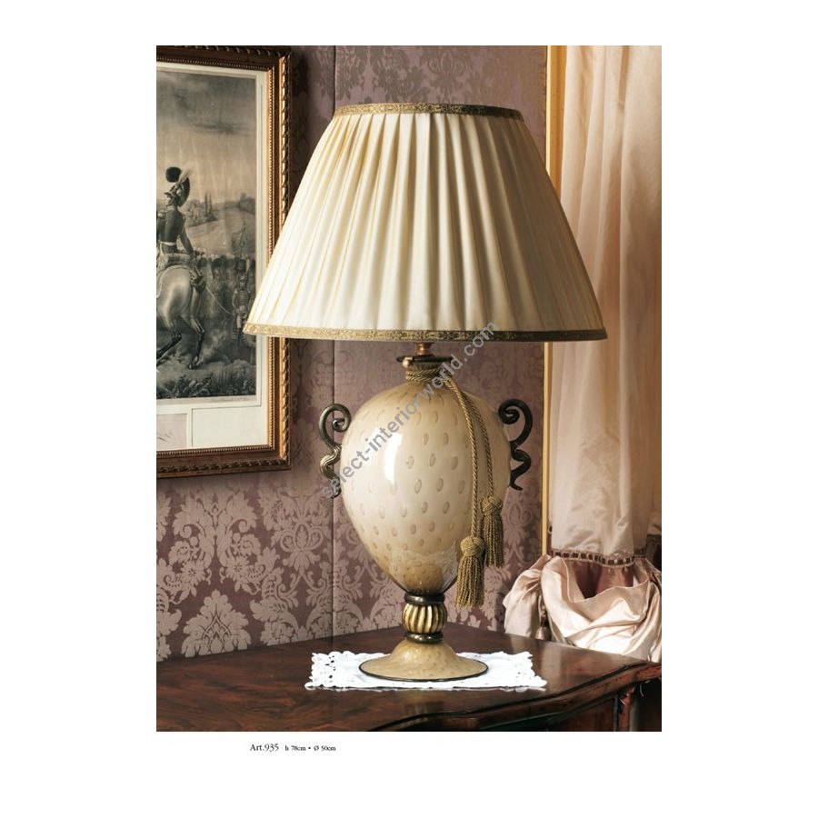 Murano glass table lamp complete with lampshade. Tassel ""Grossa oro"" not included in the price. Lighting item that diffuses the light with great effect in the surrounding environement creating a warm and welcoming atmosphere.