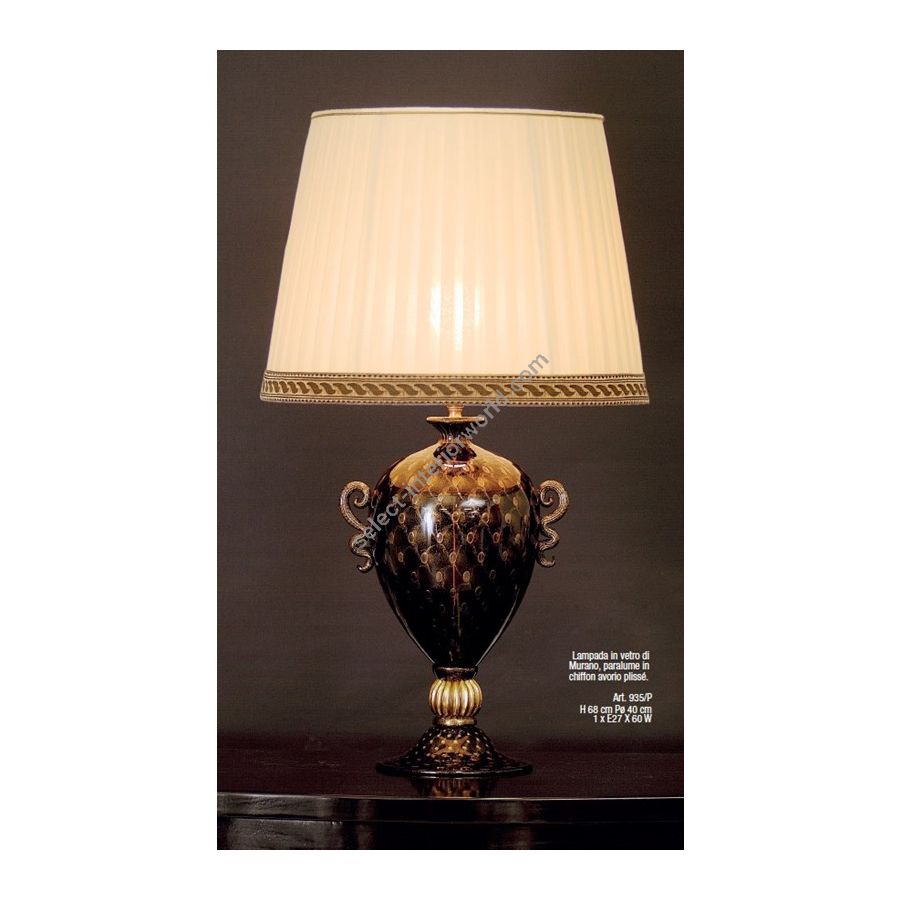 Lamp in Murano glass, shade in pleated ivory chiffon. Lighting fixture that diffuses the light into the surrounding environment with great effect, creating a warm and welcoming atmosphere.