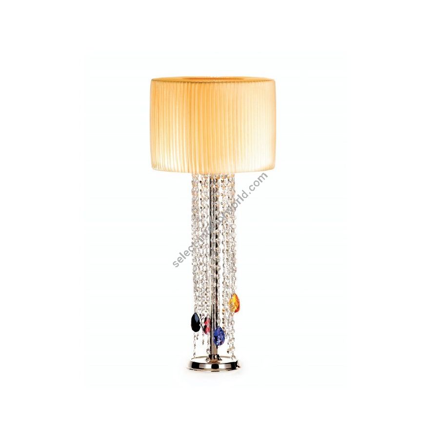 Table lamp with cylindrical lampshade and crystal pendants. Lighting item that diffuses the light with great effect in the surrounding environement creating a warm and welcoming atmosphere.
