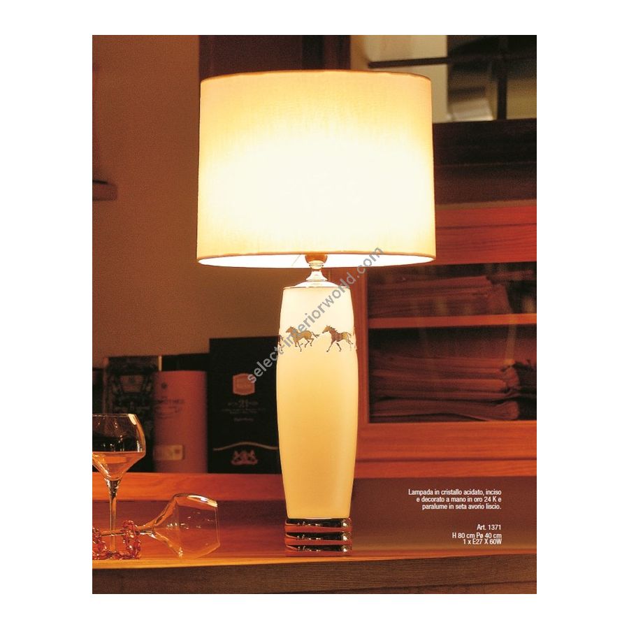 Table Lamp in matt Florentine crystal engraved and decorated by hand in Gold 24K with lamphshade in smooth ivory fabric. Lighting item that diffuses the light with great effect in the surrounding environement creating a warm and welcoming atmosphere.