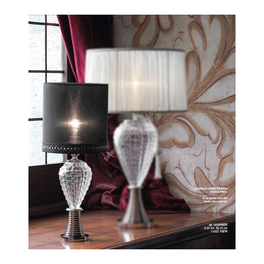 Table lamp in trasparent Italian crystal hand-cut. Lighting item that diffuses the light with great effect in the surrounding environement creating a warm and welcoming atmosphere.