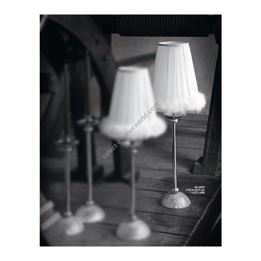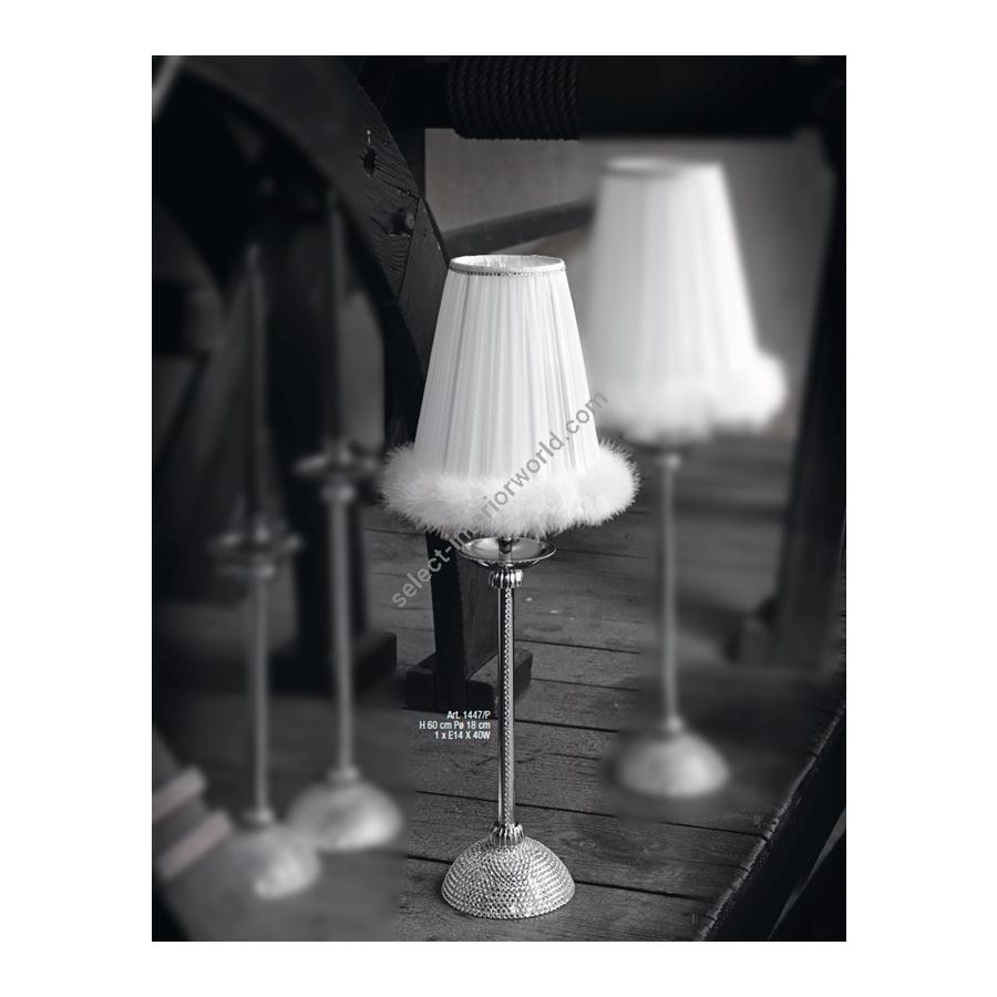 Table lamp with Swarovski® inserts, chiffon lampshade on ivoly lining and plumed braid. Lighting item that diffuses the light with great effect in the surrounding environement creating a warm and welcoming atmosphere.