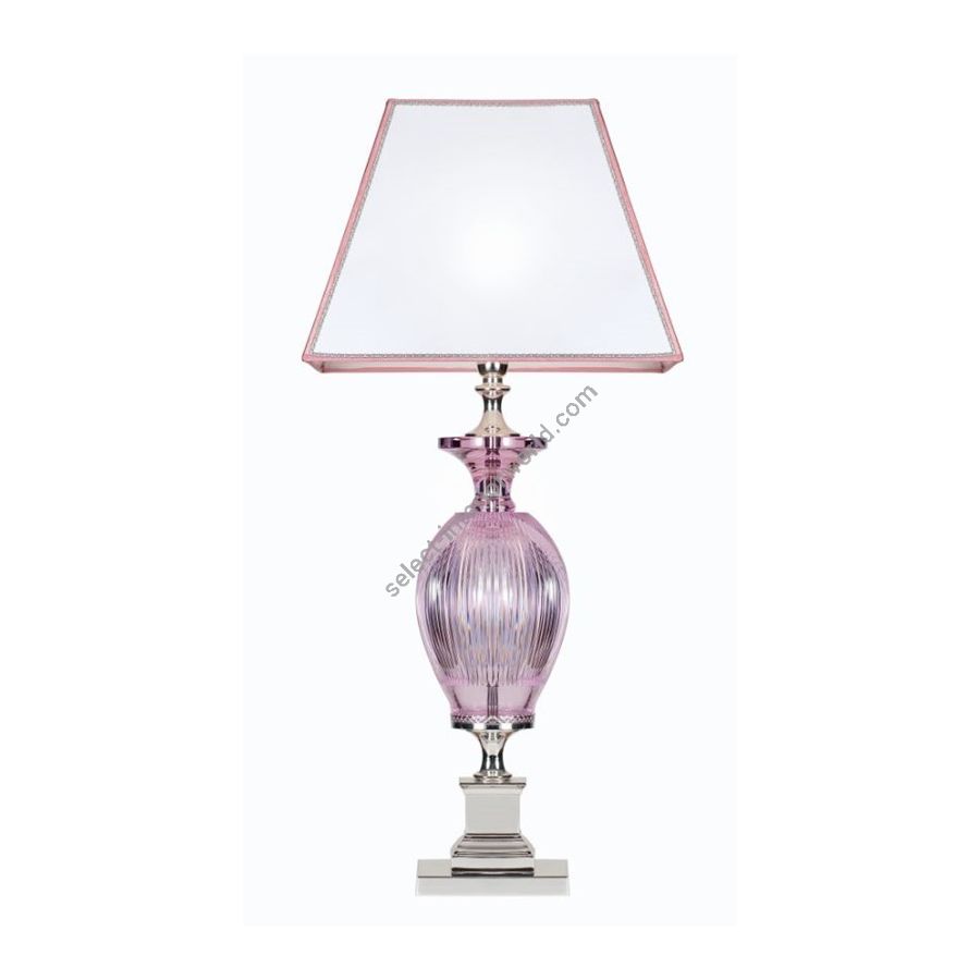 Table lamp in italian pink crystal cut by hand and square ivory lampshade. Lighting item that diffuses the light with great effect in the surrounding environement creating a warm and welcoming atmosphere.