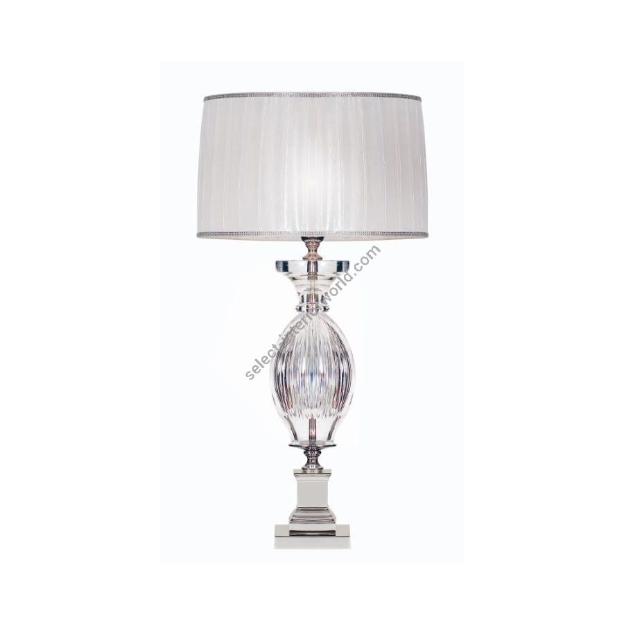 Table lamp in clear Italian crystal and double fabric lampshade. Lighting item that diffuses the light with great effect in the surrounding environement creating a warm and welcoming atmosphere.
