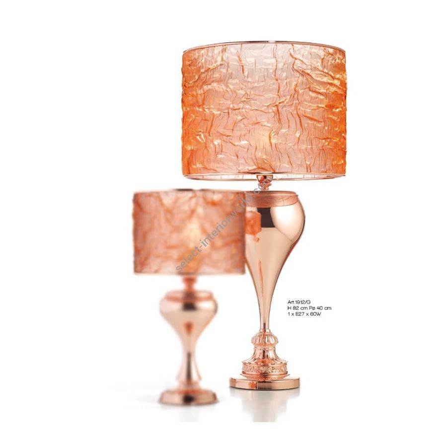 Table lamp with lampshade in copper metal fiber. Lighting item that diffuses the light with great effect in the surrounding environement creating a warm and welcoming atmosphere.