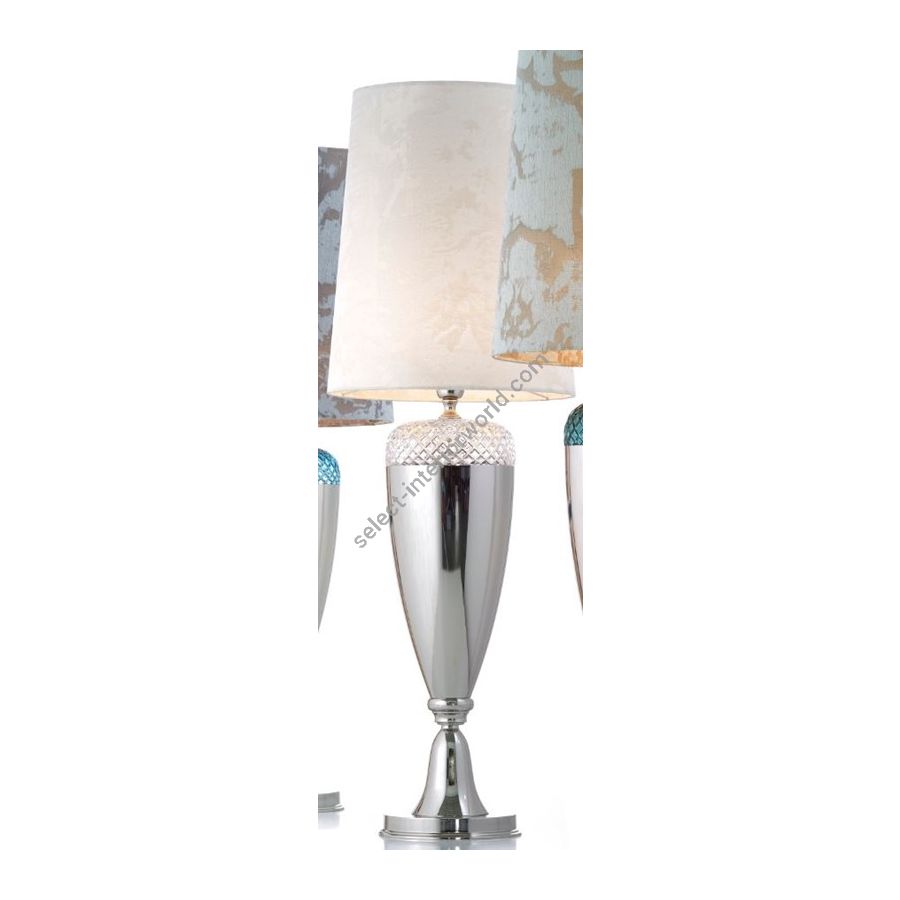 Table lamp with metal and water green italian hand-cutted Crystal (pb24%) and double switch. Lighting item that diffuses the light with great effect in the surrounding environement creating a warm and welcoming atmosphere.