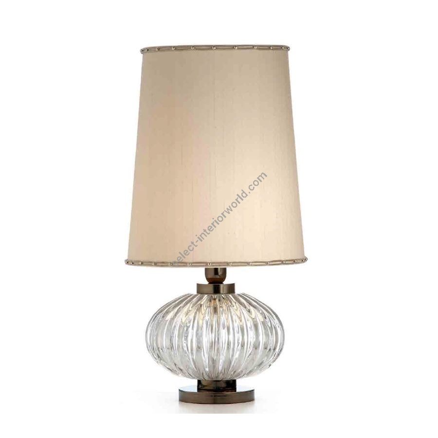 Table lamp with trasparent Murano glass. Lighting item that diffuses the light with great effect in the surrounding environement creating a warm and welcoming atmosphere.