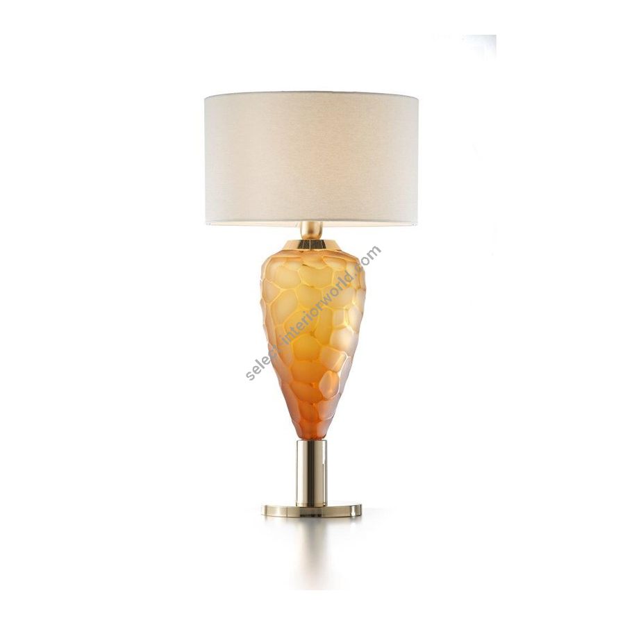 Table lamp in matt amber Italian crystal and fabric lampshade. Lighting item that diffuses the light with great effect in the surrounding environement creating a warm and welcoming atmosphere.